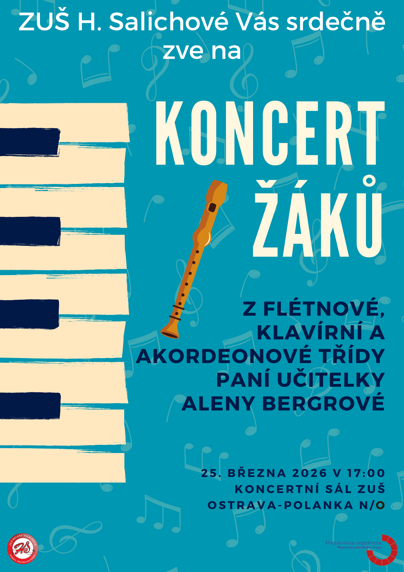 Srdečně Vás zveme na koncert žáků ze třídy paní učitelky Aleny Bergrové, který se uskuteční ve středu 25. března 2026 v 17:00 v koncertním sále ZUŠ v Ostravě - Polance nad Odrou.