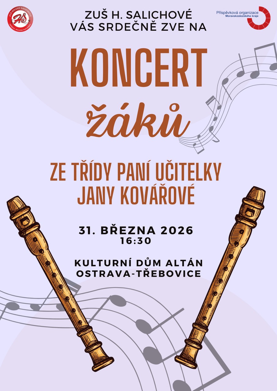 Srdečně Vás zveme na koncert žáků ze třídy paní učitelky Jany Kovářové, který se uskuteční v úterý 31. března 2026 v 16:30 v kulturním domě Altán v Ostravě-Třebovicích.